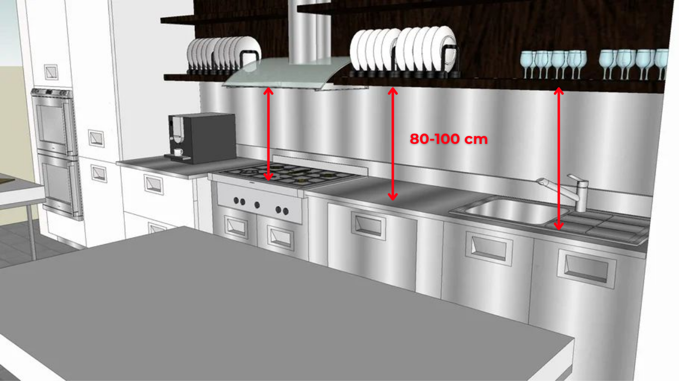 Mỗi nhân viên trong khu bếp cần không gian làm việc riêng với khoảng cách tối thiểu 80–100 cm giữa các thiết bị.