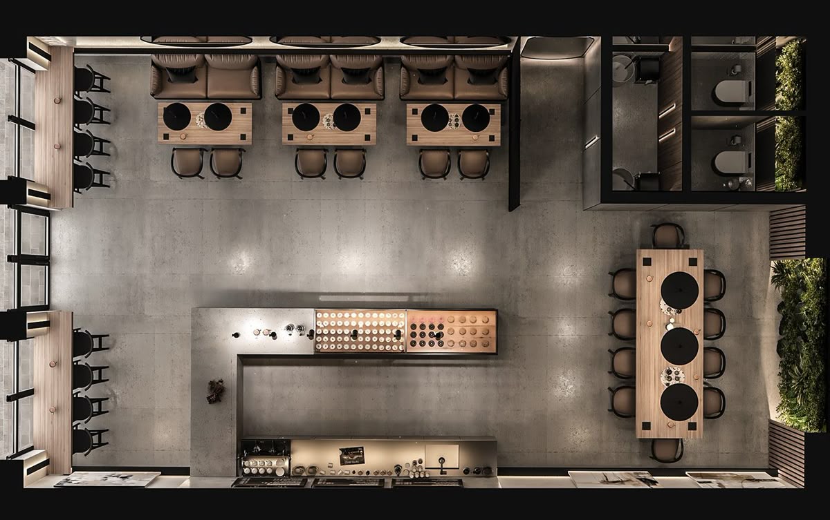 • Trục phụ kết nối mềm mại giữa các cụm bàn, đảm bảo luồng đi lại không cắt ngang tầm nhìn hoặc không gian ăn uống của khách.